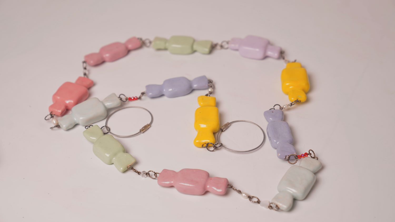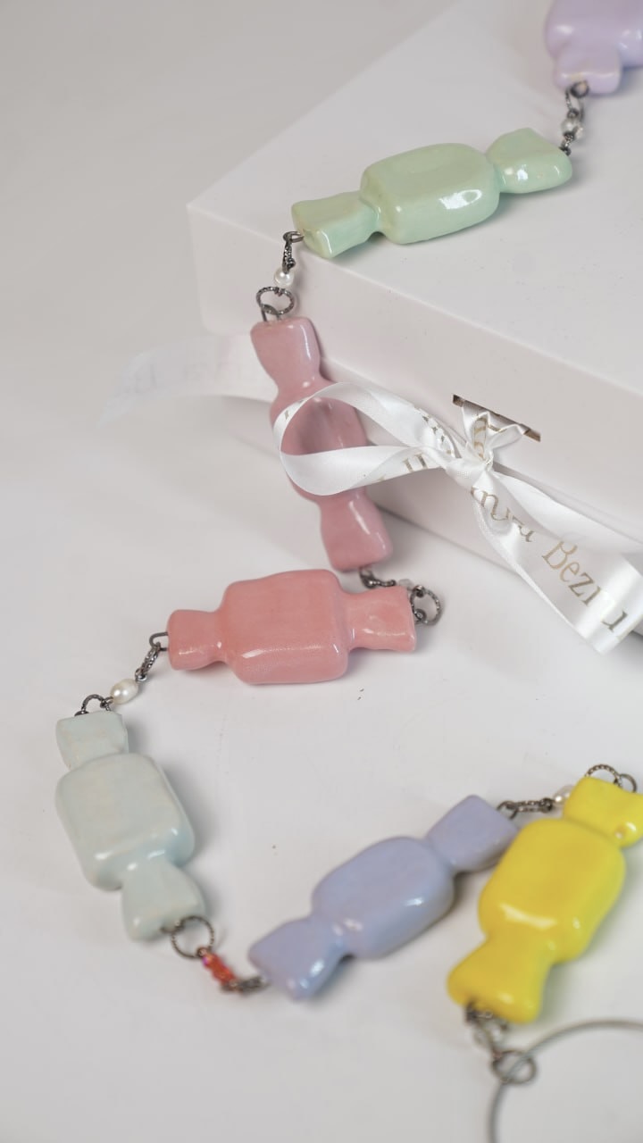 Глина, глазурь, речной жемчуг, перламутр, стеклянные бусины , фурнитура, стальной жгут. Уникальное произведение. Россия, 2025.