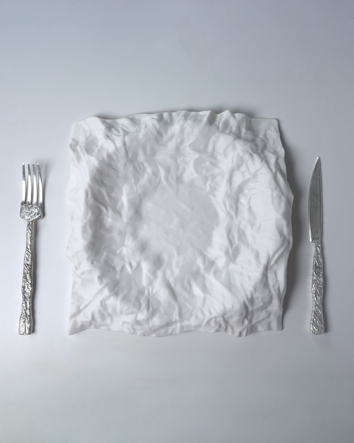 Авторская серебристая вилка TISSUE FORK на черном фоне