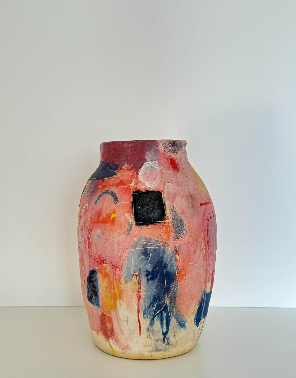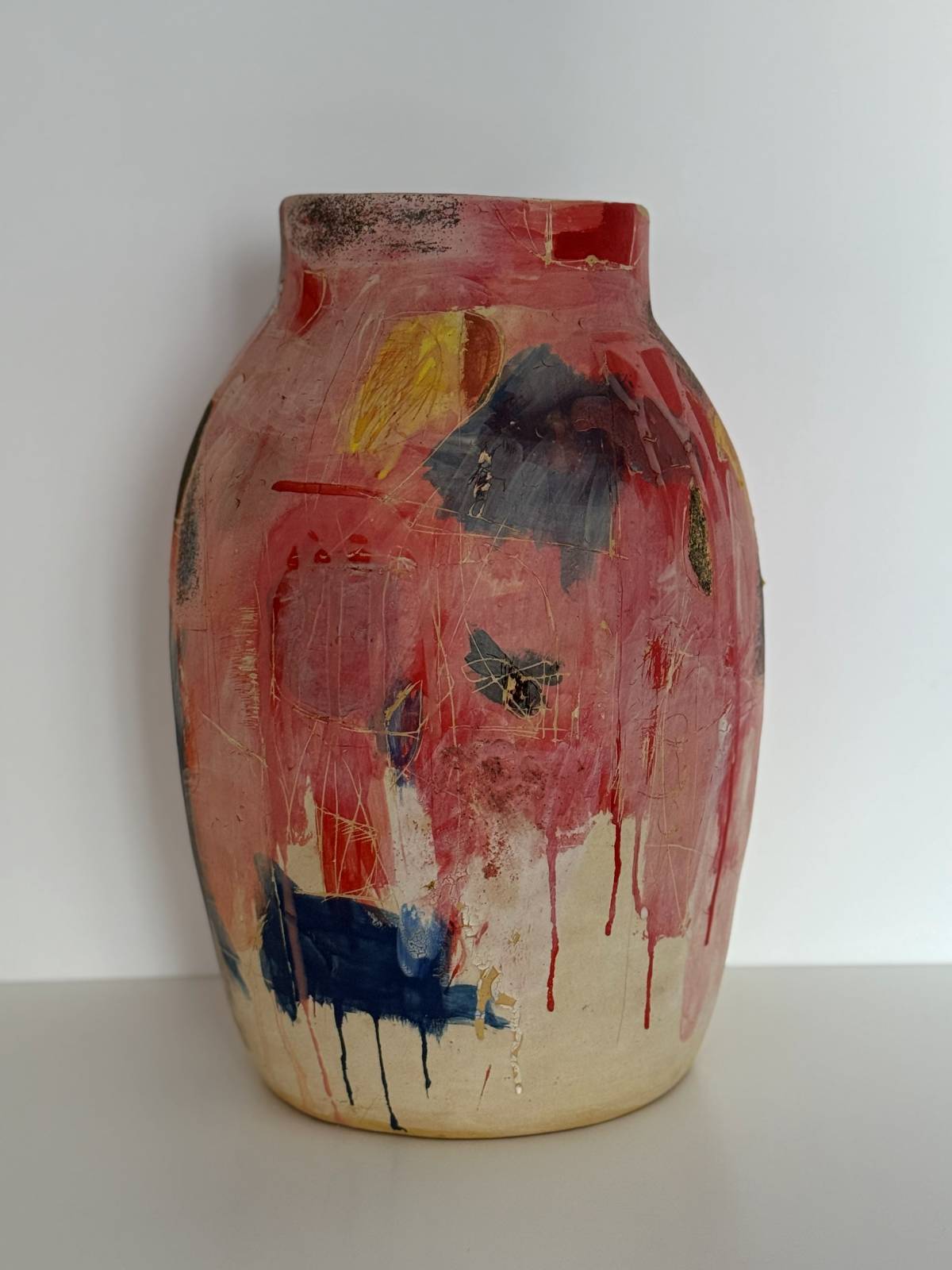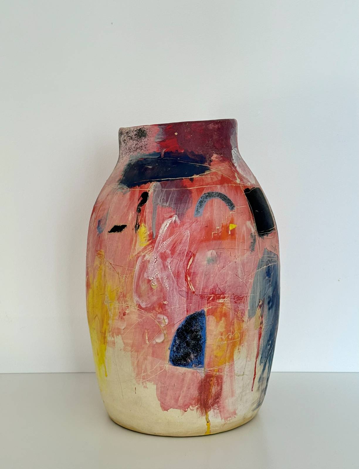 Ваза с голубой линией Марии Софроновой — керамическая ваза с абстрактной росписью в синих, красных и желтых тонах, 2024