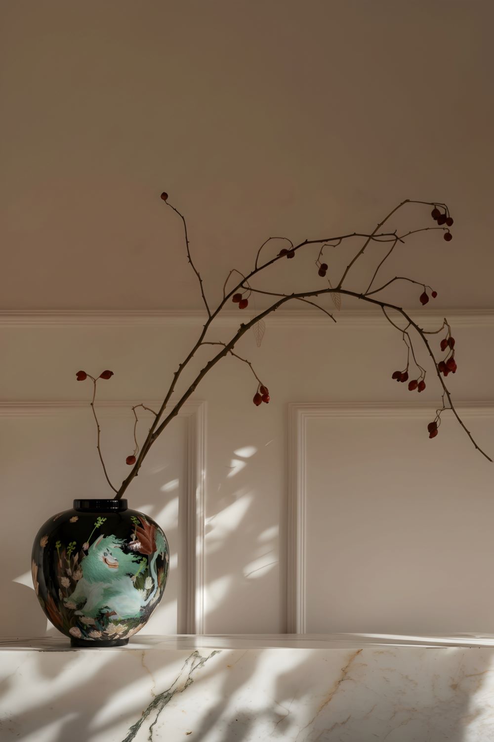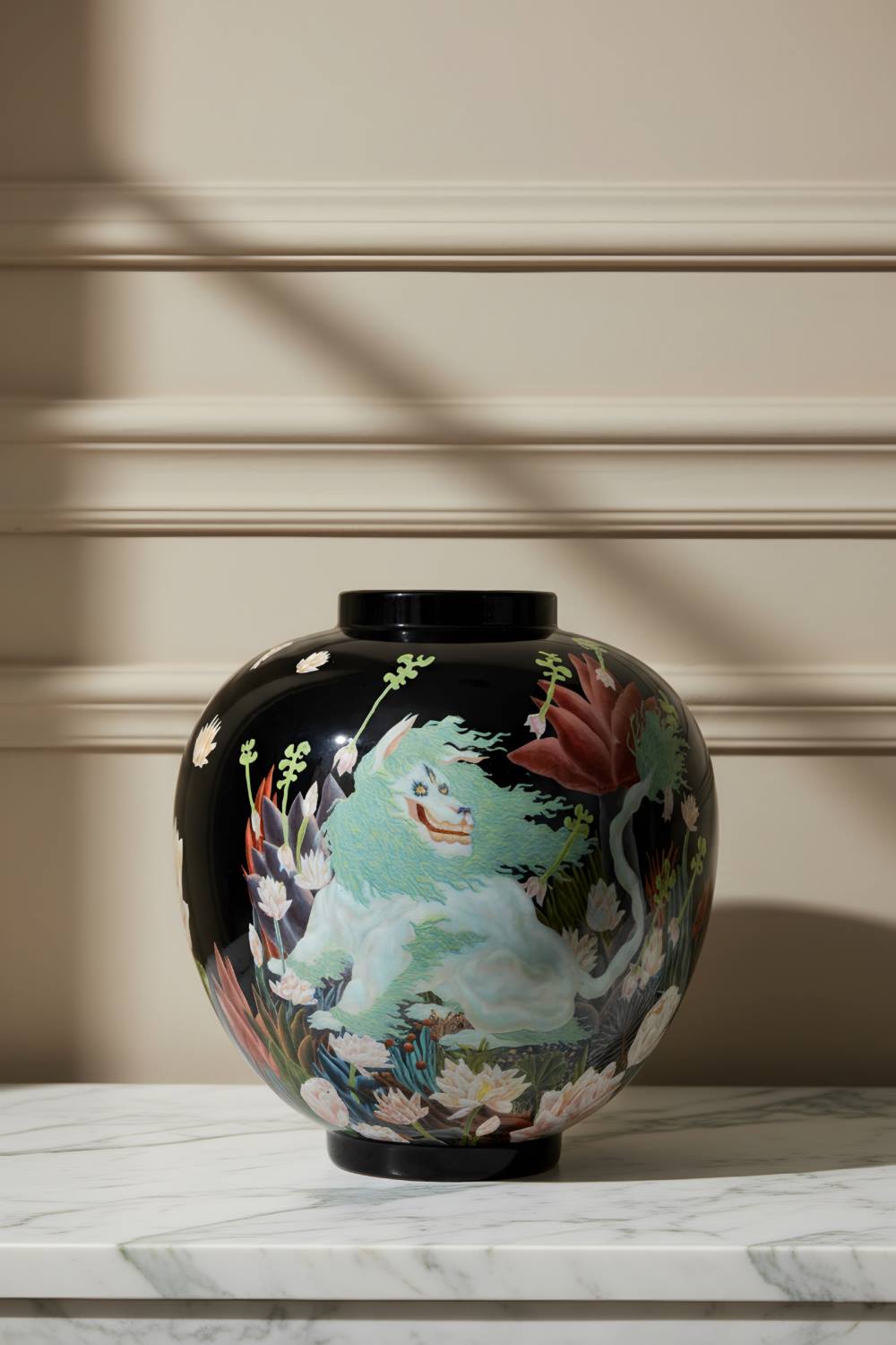 SAMPLE в коллаборации с Викой Когай создали уникальную вазу с изображением Снежного льва. В буддийской мифологии этот персонаж символизирует мудрость и смелость. Цветы на вазе — отсылка к мифу об отравленных стрелах, которые демон Марра напустил на Будду, стремясь помешать его просветлению под деревом Бодхи.