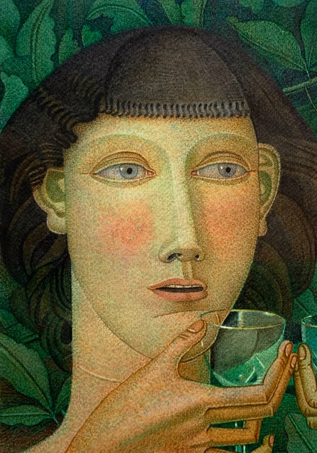 Яркая графика женщины с закрытыми глазами и руками в воде, серия «Эмоджи», акрил, клей