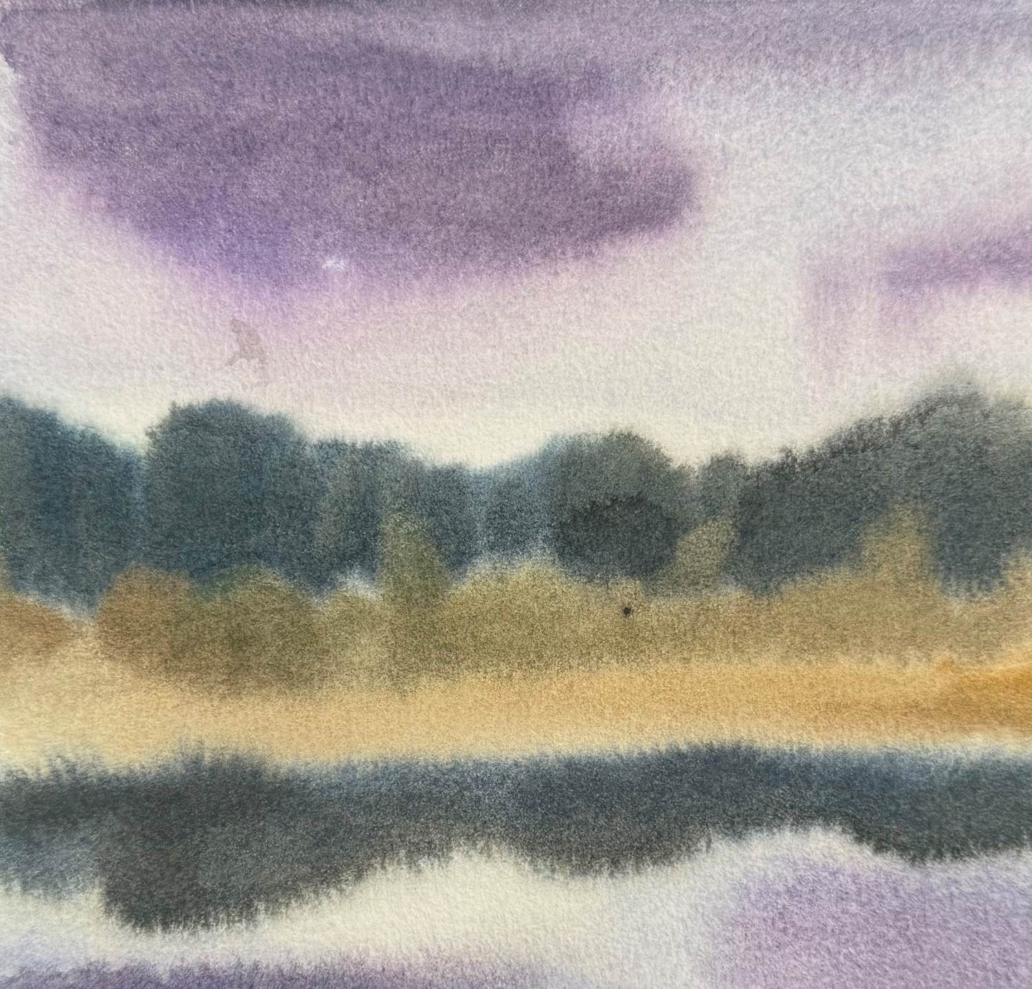 Акварель «Landscape» Арины Шабановой – абстрактный пейзаж с зелёными холмами и озером, современная графика.