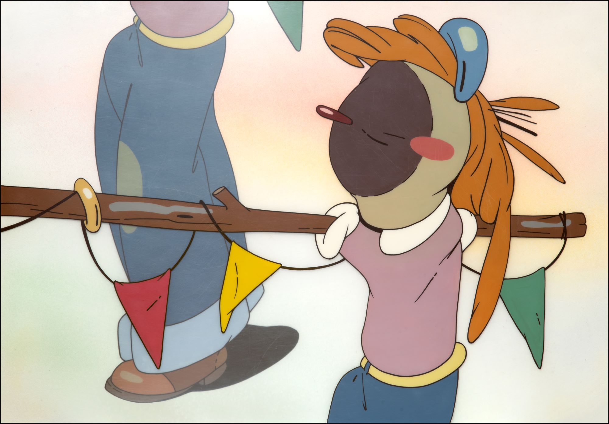 Графика «Привет» Александры Бурмистровой – девочка в красном и осёл, акрил на бумаге, деревенский сюжет.