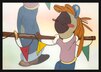 Две фигуры с принтами еды на фоне зала дворца. Коллаж на бумаге, авторская техника