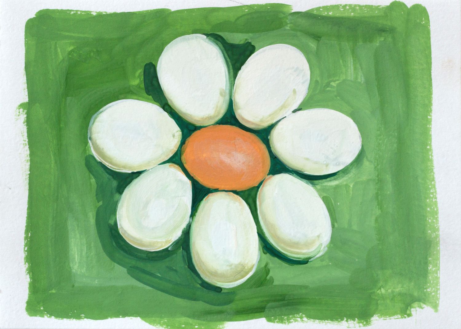 Картина Дарьи Барыбиной 'Кораблик' (2021), гуашь на бумаге, 11.3×17 см. Изображен белый бумажный кораблик на синей воде