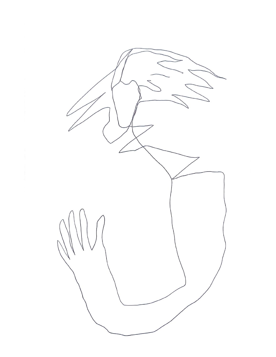 «Немая серия 9» — обнажённая фигура с серьгой и вытянутыми руками у стола, рисунок ручкой, Syhmen