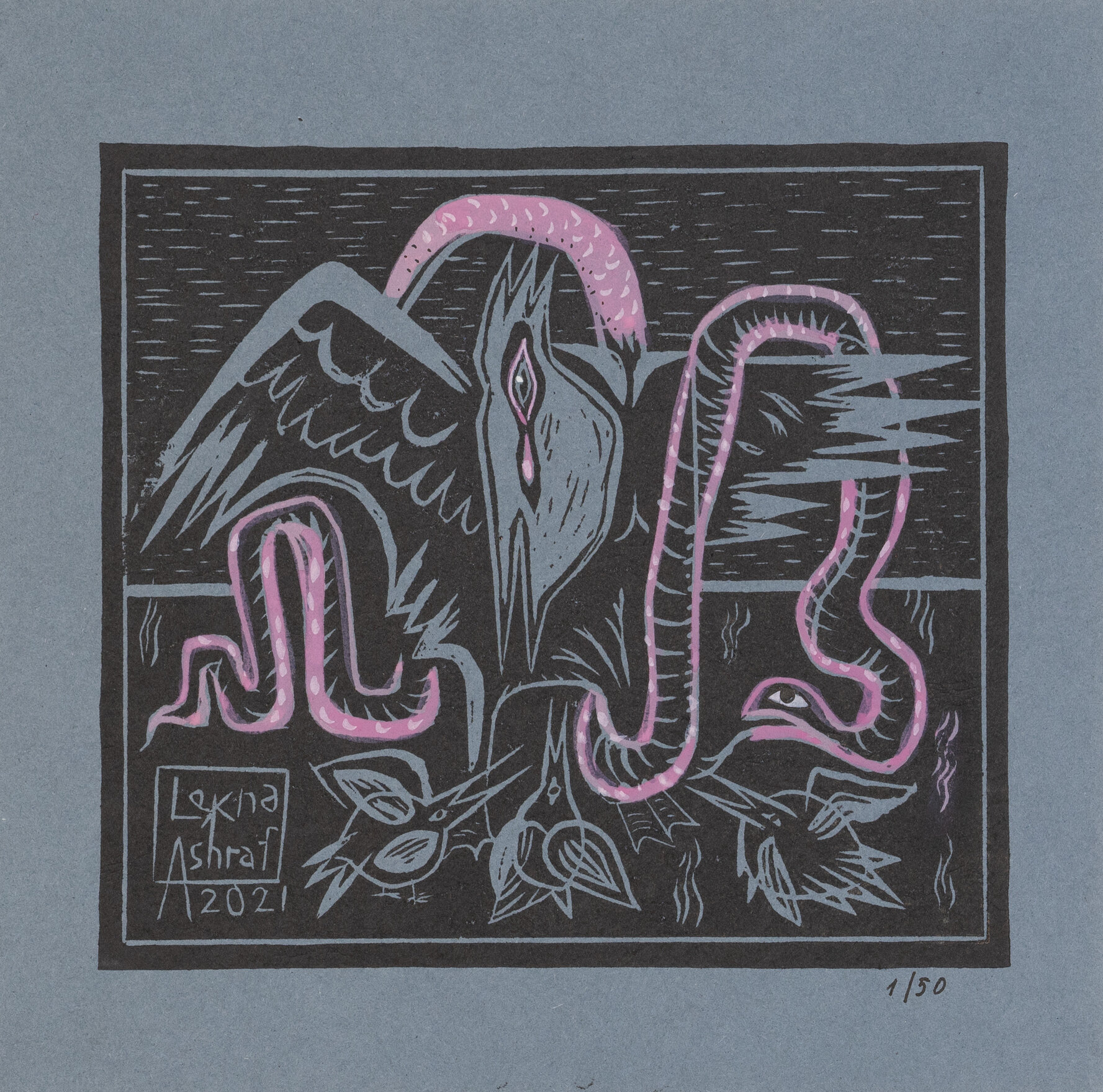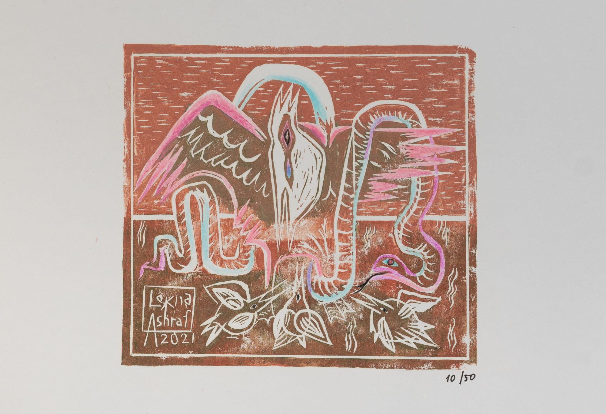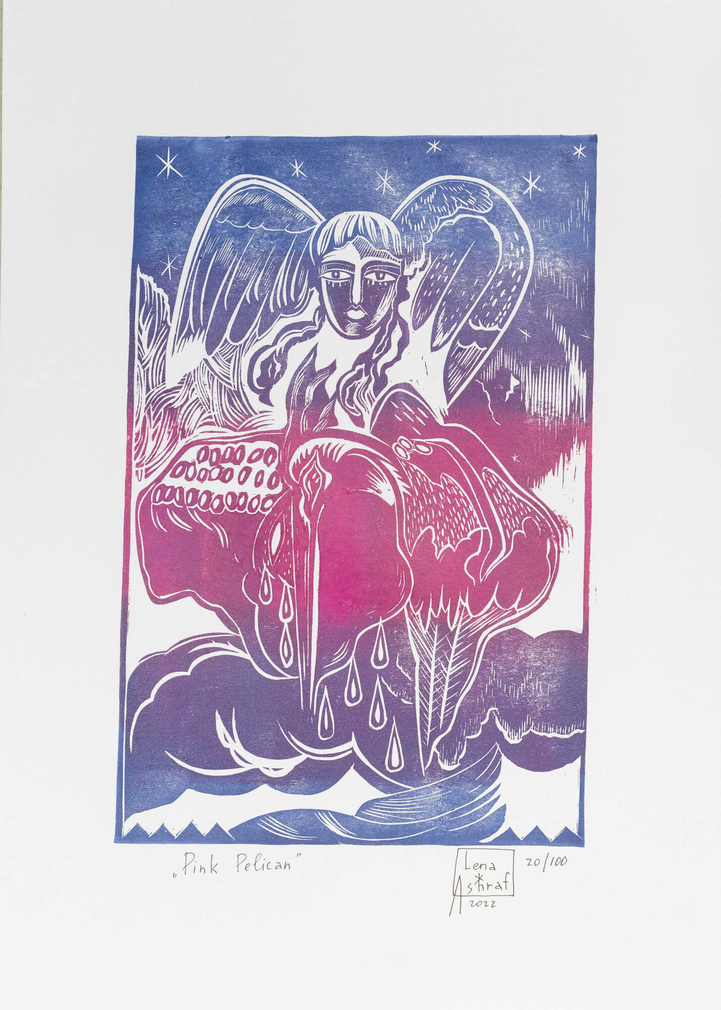 Автопортрет пеликаном — акварель Лены Ашраф с фантазийным образом птицы и женщины