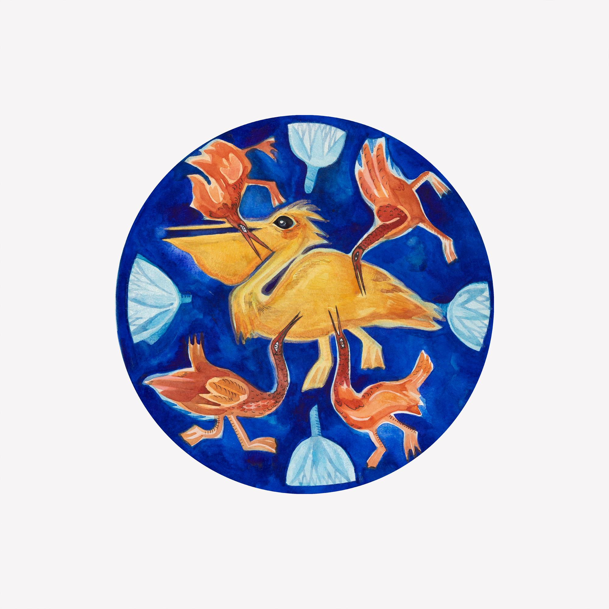 Акварель Лены Ашраф — два розовых пеликана в круге, современная графика на синем фоне