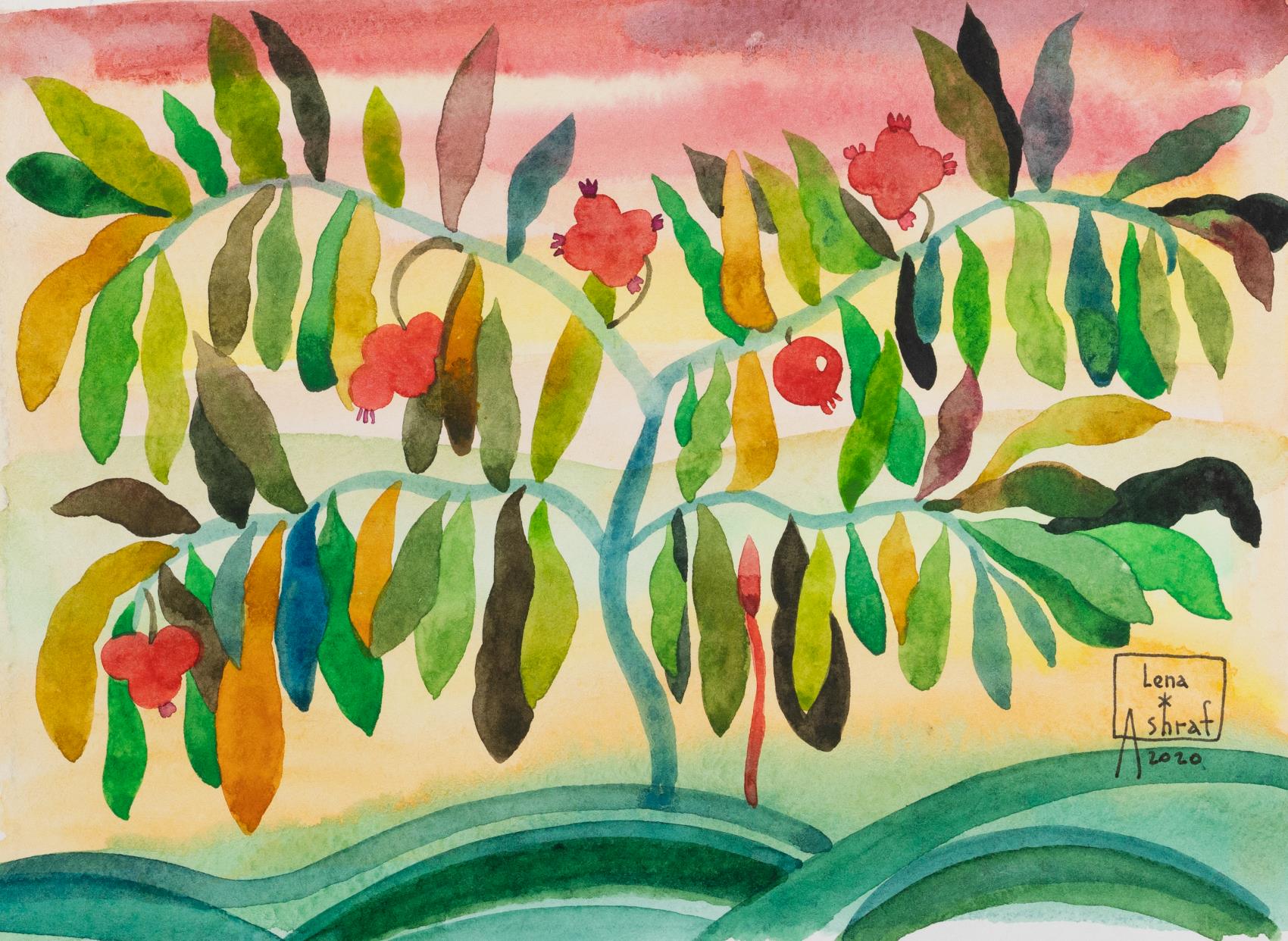 Акварель Лены Ашраф — абстрактный портрет с глазами среди цветочных и растительных мотивов
