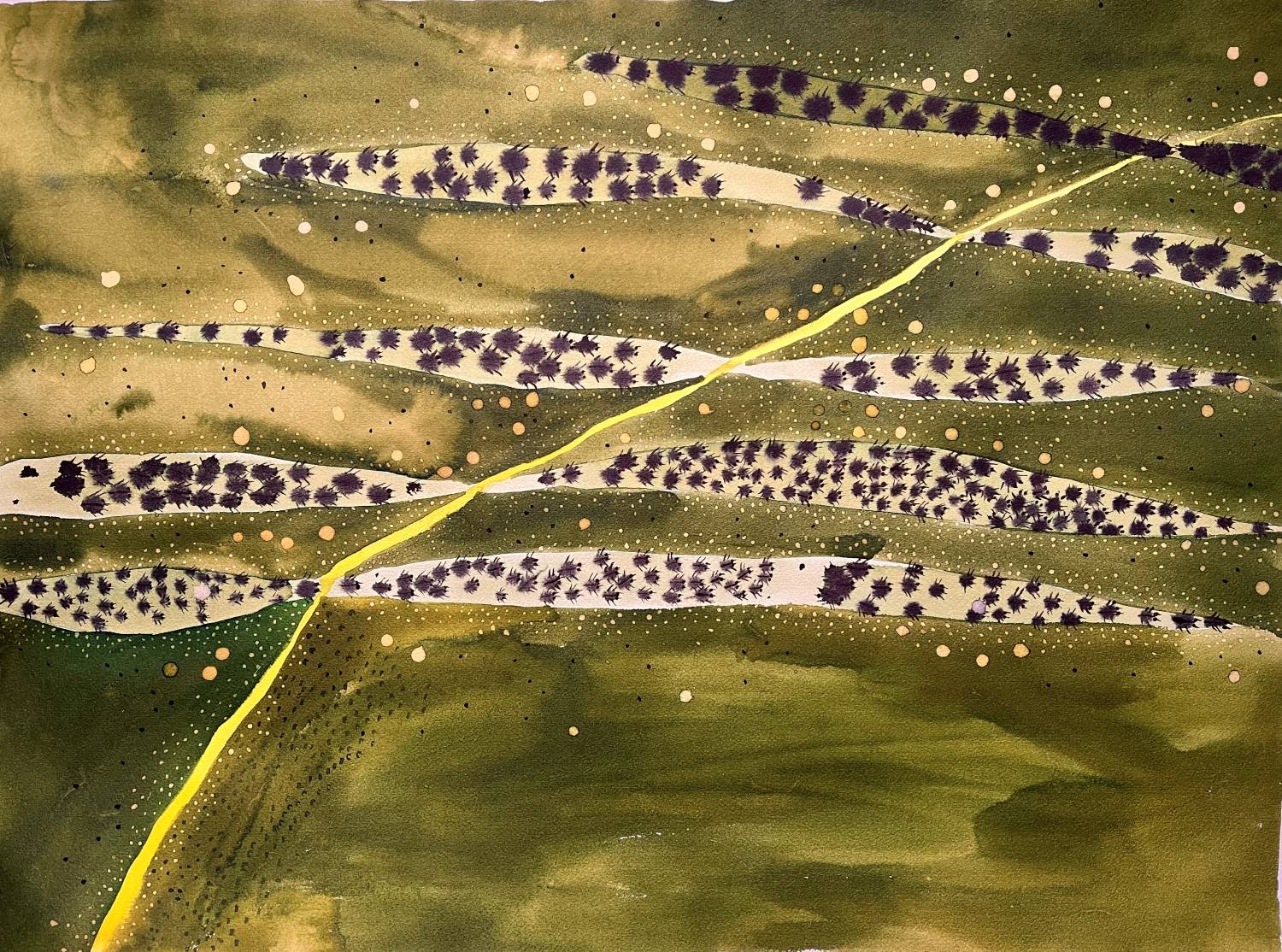 Акварельный пейзаж с огнём и небом, экспрессивная живопись, современная графика, Катя Бровкина