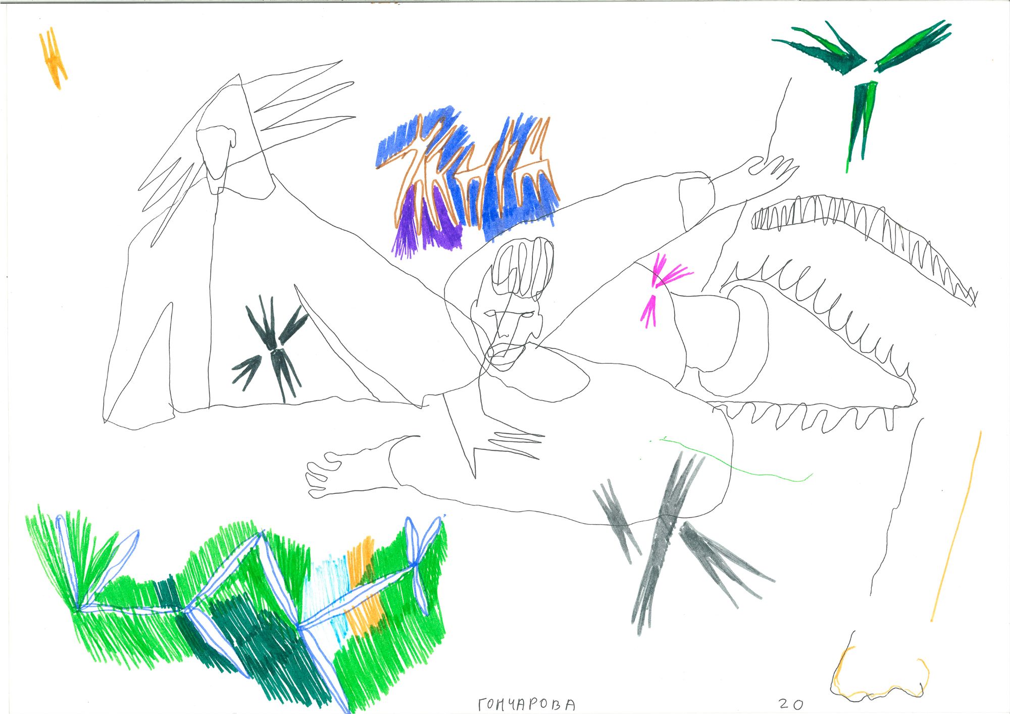 Цветная графика с контуром фигуры на траве, фломастер, серия Берлин, автор Наташа Гончарова