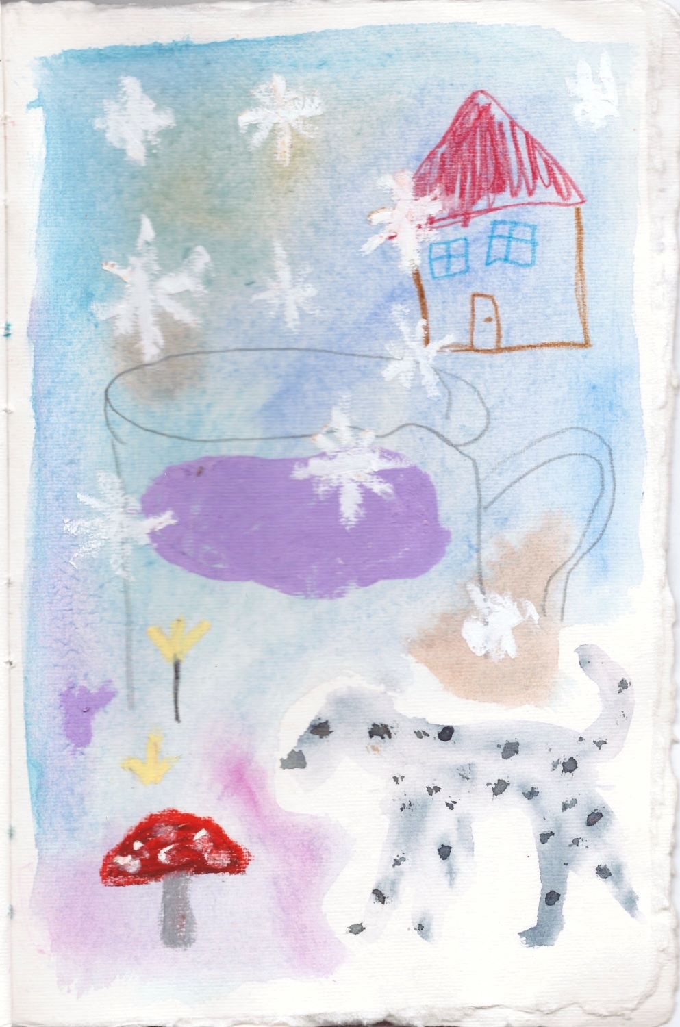 Бумага хлопковая, акварель, масляная пастель, карандаш, ручка, реди-мейд, смешанная техника. Уникальное произведение. Россия, 2025.
