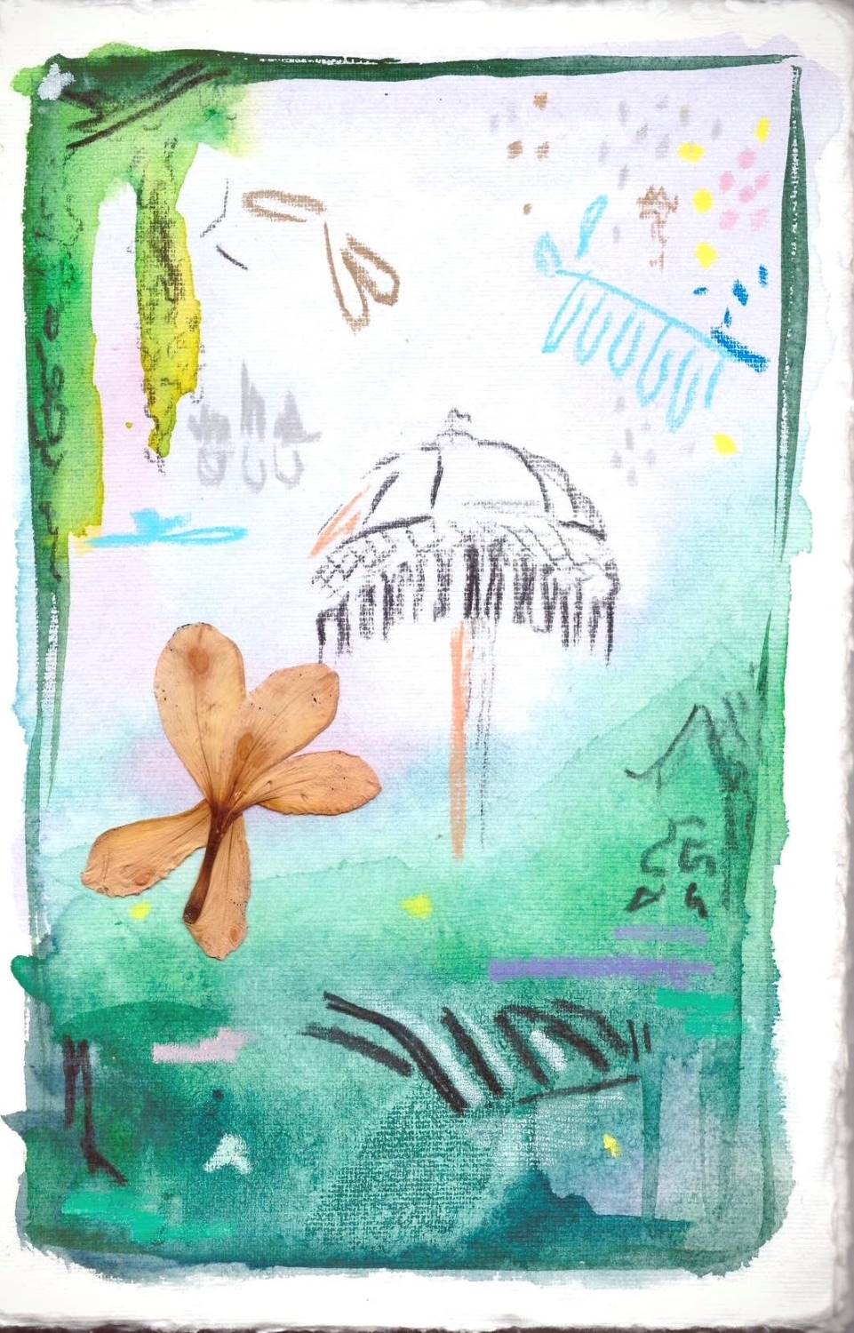Бумага хлопковая, акварель, масляная пастель, реди-мейд, смешанная техника. Уникальное произведение. Россия, 2025.