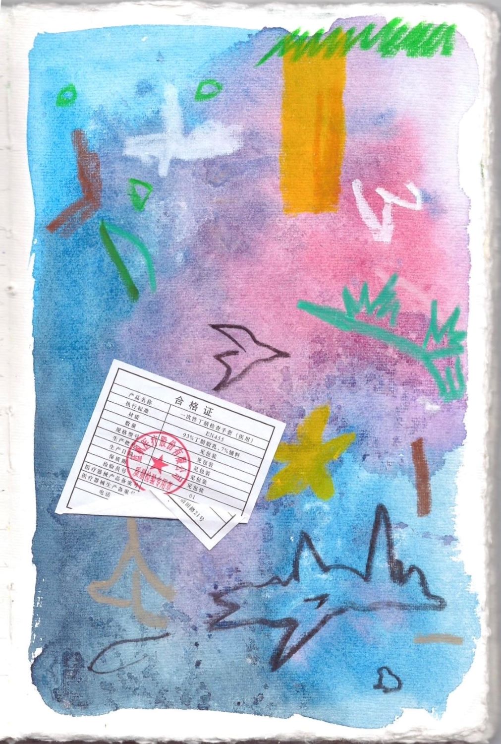 Бумага хлопковая, акварель, масляная пастель, реди-мейд, смешанная техника. Уникальное произведение. Россия, 2025.