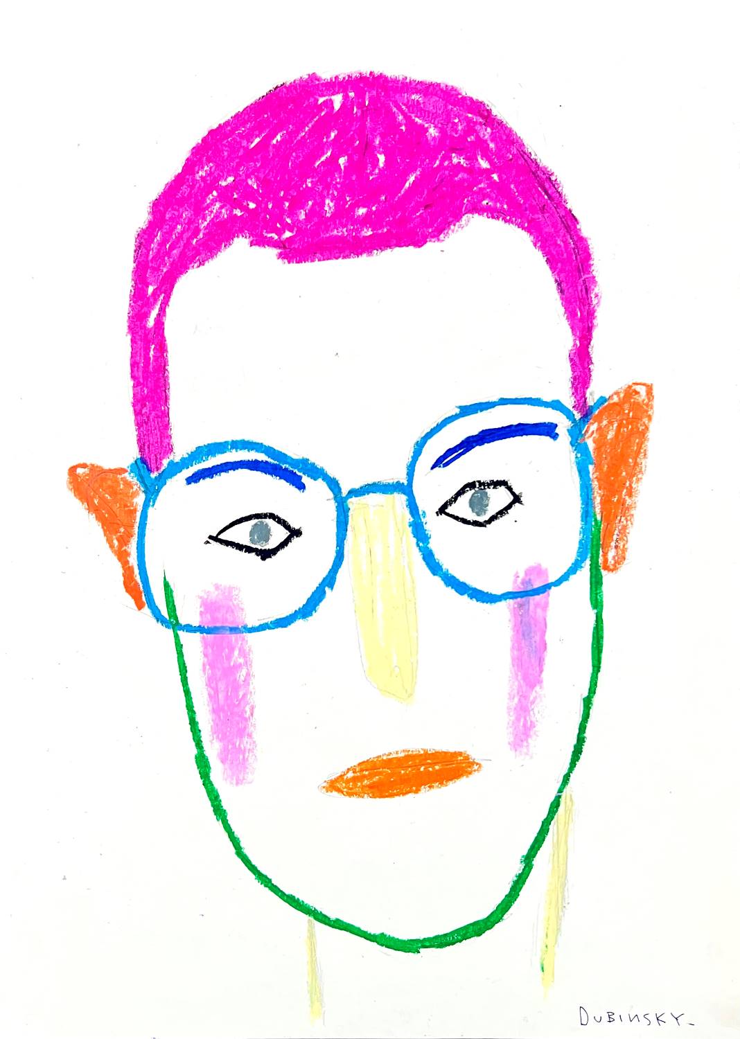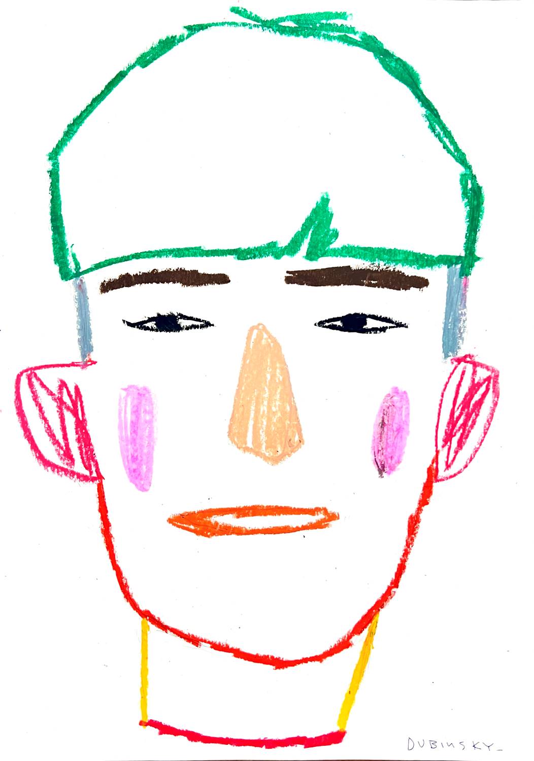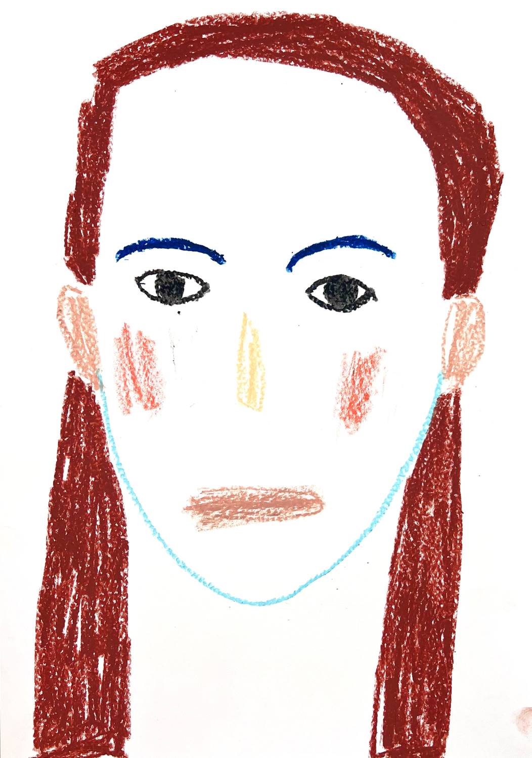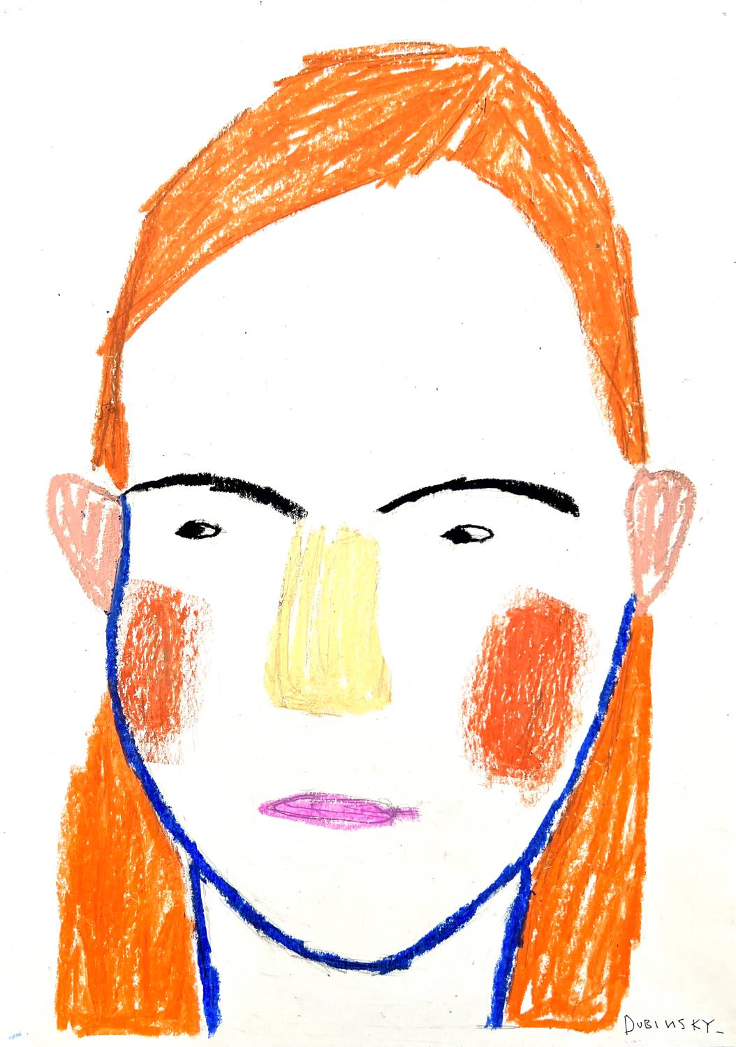 Яркий автопортрет с крупным лицом в синих и оранжевых оттенках, акварель