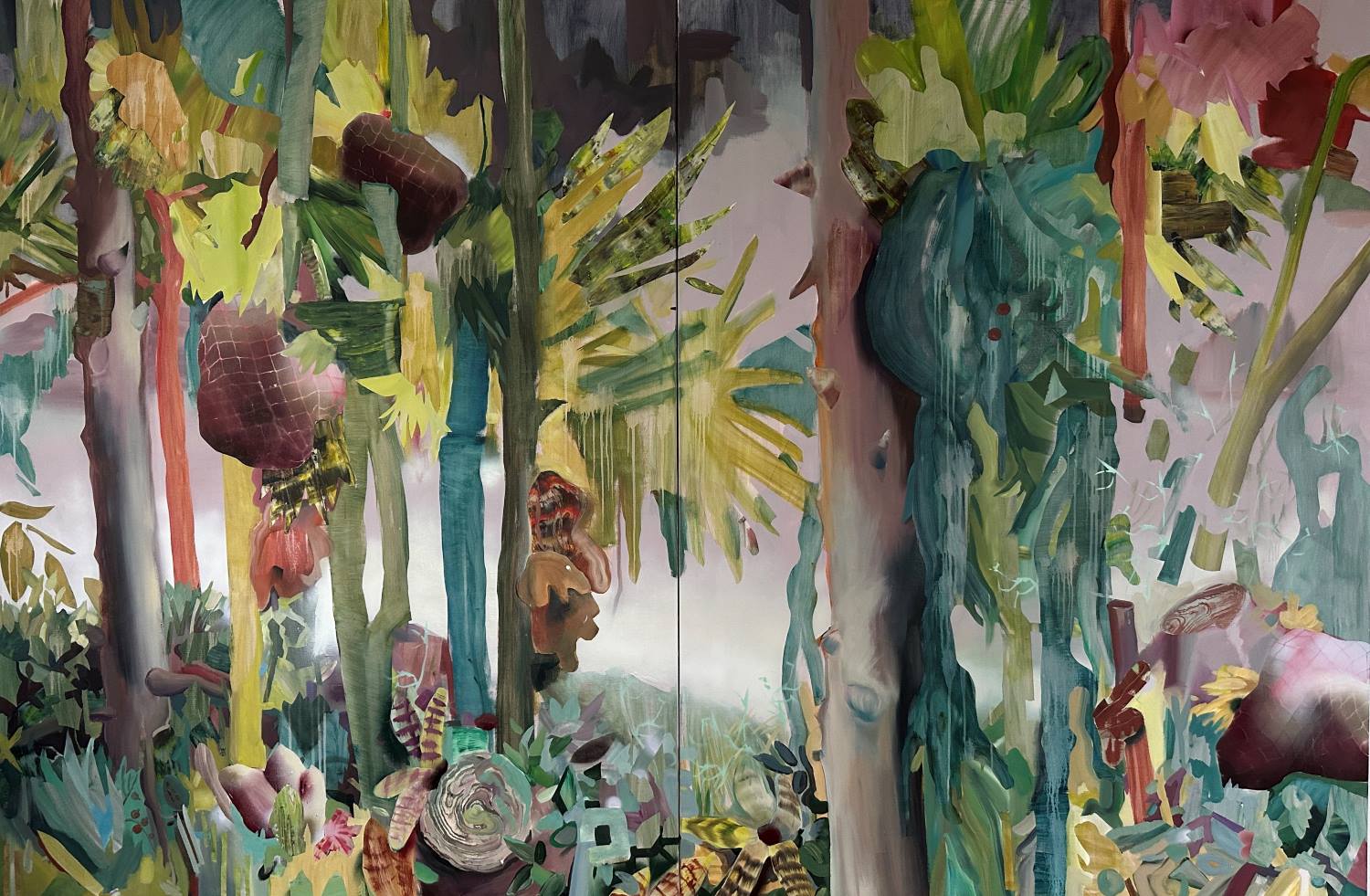 Картина с абстрактными формами и деревьями в зеленой гамме, масло и акрил, Елизавета Глушкова 2024
