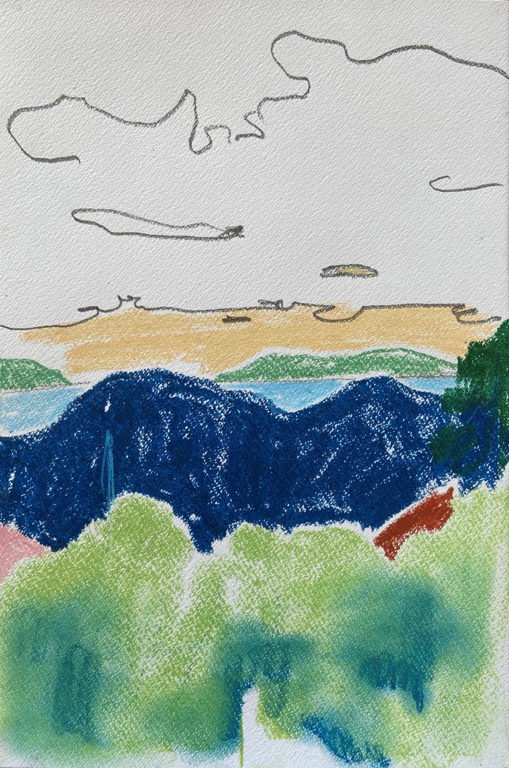 Контурный рисунок девушек на пляже, пастель на серо-жёлтой бумаге, серия Exantres, 2023