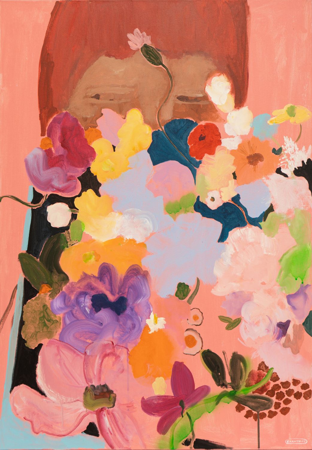 Абстрактная картина с цветами, акрил и пастель на холсте, серия Red book plants, 2023