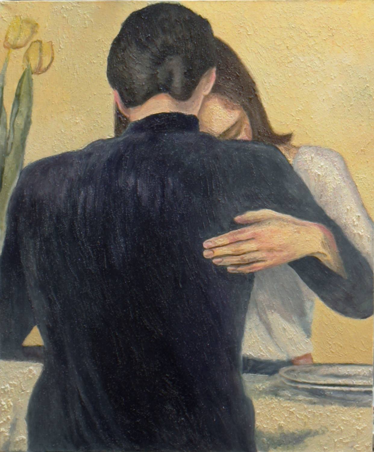 Картина маслом 'Ваза и спина' — мужчина спиной сидит за столом с вазой и бокалом, 70x45 см, 2025