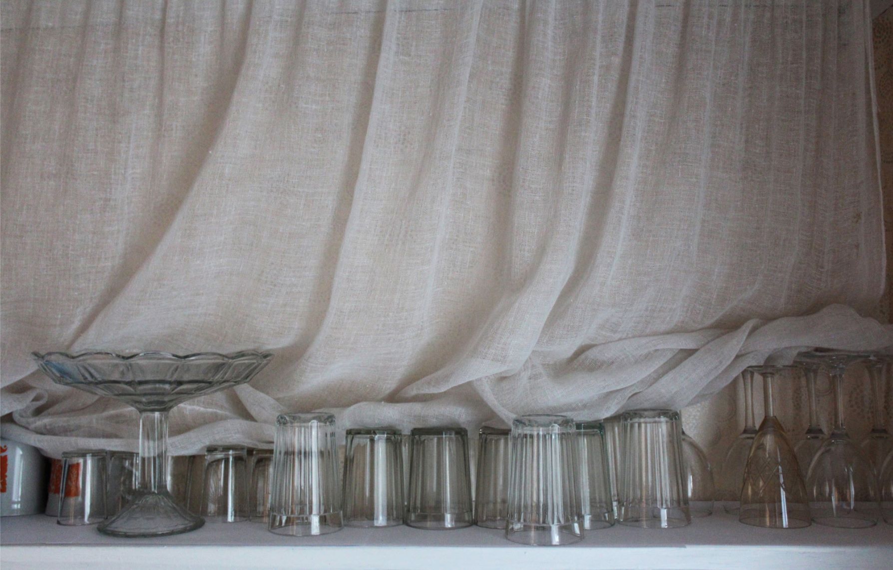 Арт-фотография «Стопки» — ряд перевёрнутых стаканов на фоне занавески