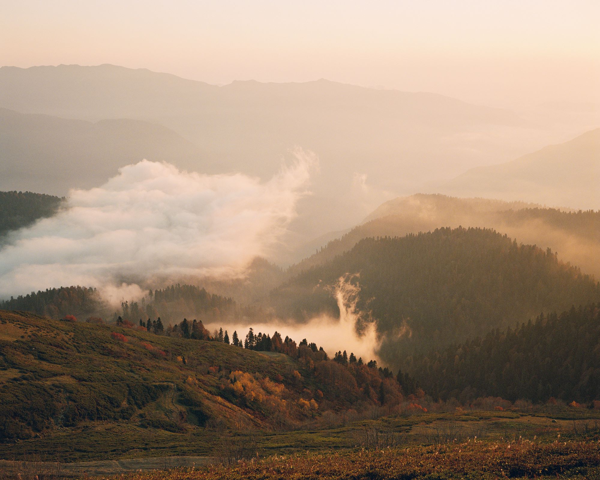 Коллаж: горы, лес, туман, прогулка, человек с собакой, серия «Своё место», 2023