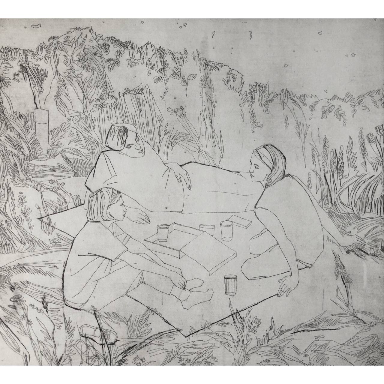Перед рассветом, Александра Бурмистрова — Офорт «Перед рассветом» — ночной пикник на траве, символический реализм, Россия, 2022.
